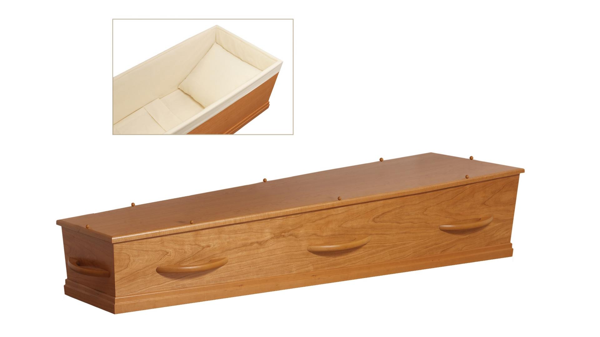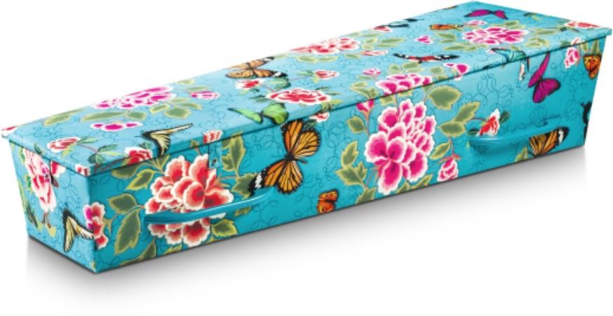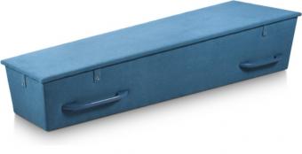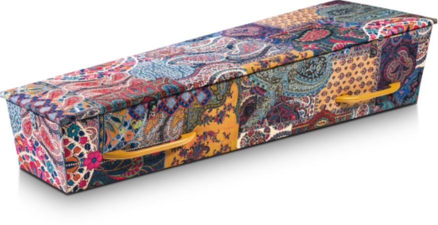 Er is een nieuwe lijn uitvaartkisten welke zich onderscheiden door toepassing van in het oog springende katoenen stoffen voorzien van een zachte, gewatteerde onderlaag.