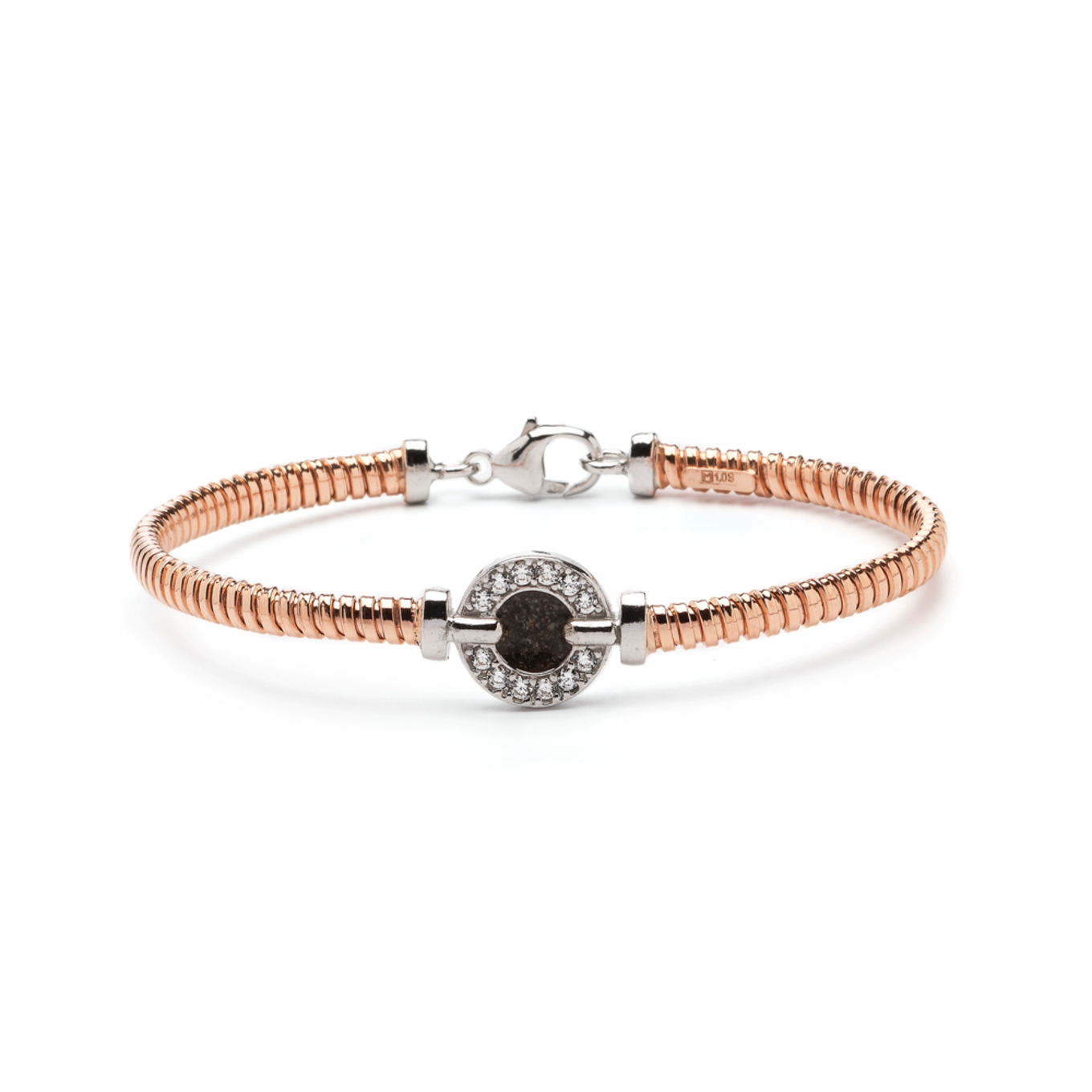 Zilveren armband gezet met zirkonia. Rosé verguld. In het midden van de asarmband bevindt zich een ornament dat is gezet met zirkonia. In dit ornament wordt de as verwerkt. Dit sieraad wordt zichtbaar aan de voorkant gevuld met as en wordt vermengd met onze speciale hars. U kunt dit niet zelf vullen, wij doen dit graag voor of met u. De standaard lengte van deze armband is 18 centimeter. Dit kunnen wij helaas niet inkorten. Heeft u een langere maat nodig, dan voorzien wij de armband van een verlengketting op de juiste maat. Wilt u weten of dit een geschikte maat is, meet dan uw polsmaat met een stuk papier en tel hier één centimeter bij op.