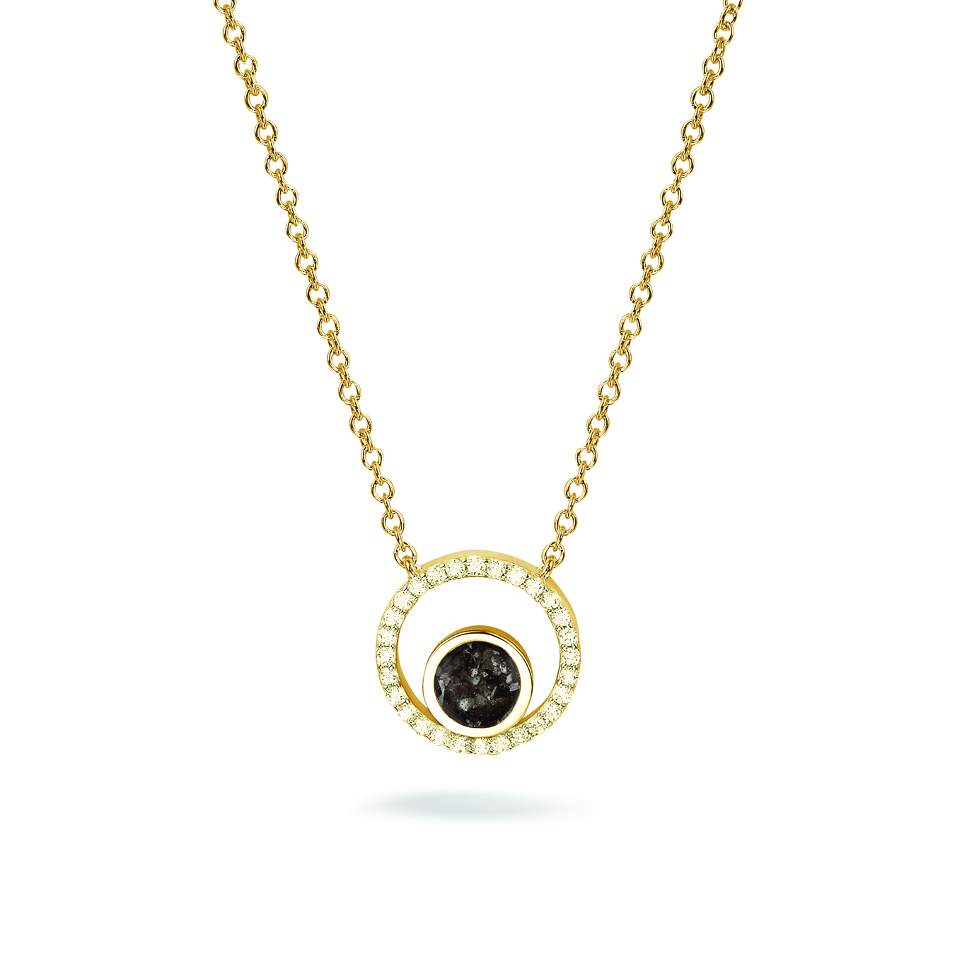 Zilveren hanger met gele oplage en zirkonia. Dit kettinkje wordt kort gedragen, op zo'n 40 cm. Inclusief jasseron verlengkettinkje waardoor het collier tot 45 cm gedragen kan worden. Dit sieraad wordt zichtbaar aan de voorkant gevuld met as of haar en wordt vermengd met speciale hars. U kunt dit niet zelf vullen, wij doen dit graag voor of met u.