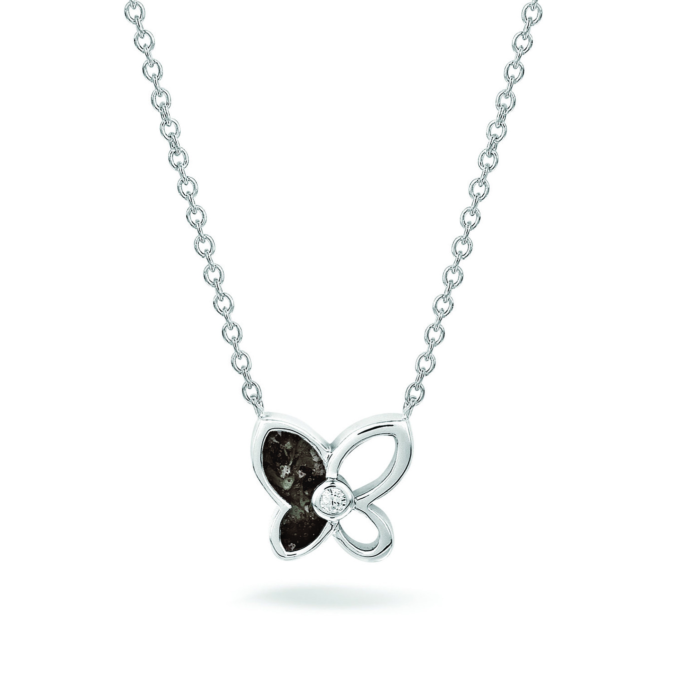 Zilveren vlinder hanger met zirkonia. Dit kettinkje wordt kort gedragen, op zo'n 40 cm. Inclusief jasseron verlengkettinkje waardoor het collier tot 45 cm verstelbaar is. Dit sieraad wordt zichtbaar aan de voorkant gevuld met as of haar en wordt vermengd met speciale hars. U kunt dit niet zelf vullen, wij doen dit graag voor of met u.