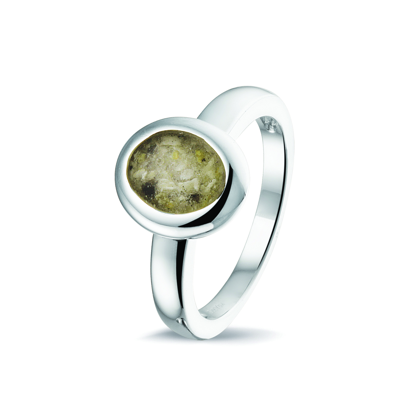 Zilveren ring, ovaal. Dit sieraad wordt zichtbaar aan de voorkant gevuld met as en wordt vermengd met speciale hars. U kunt dit niet zelf vullen, wij doen dit graag voor of met u.