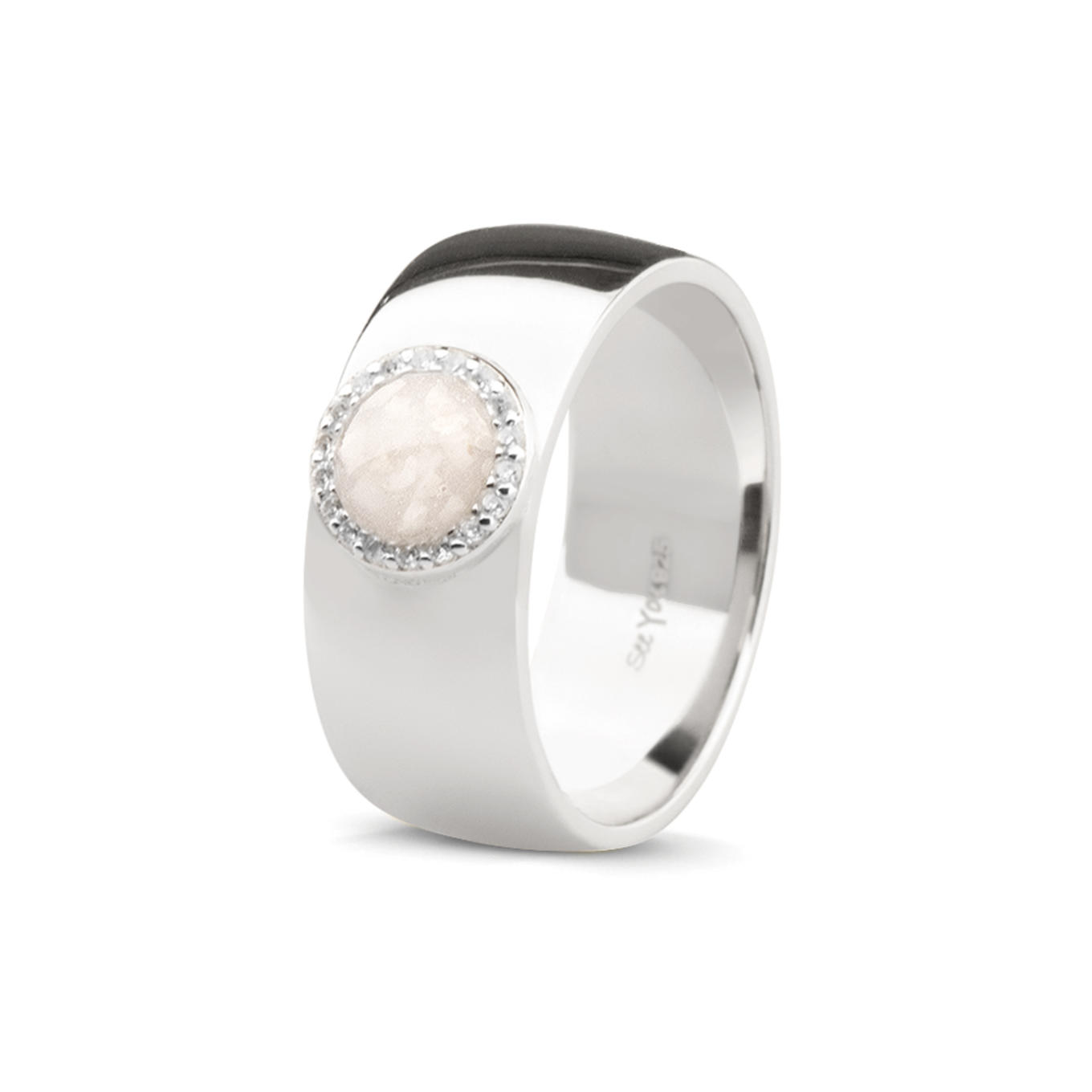 Ring in zilver met zirkonia of goud met diamant. Dit sieraad wordt zichtbaar aan de voorkant gevuld met as en wordt vermengd met speciale hars. Dit kunnen wij voor u of met u doen.